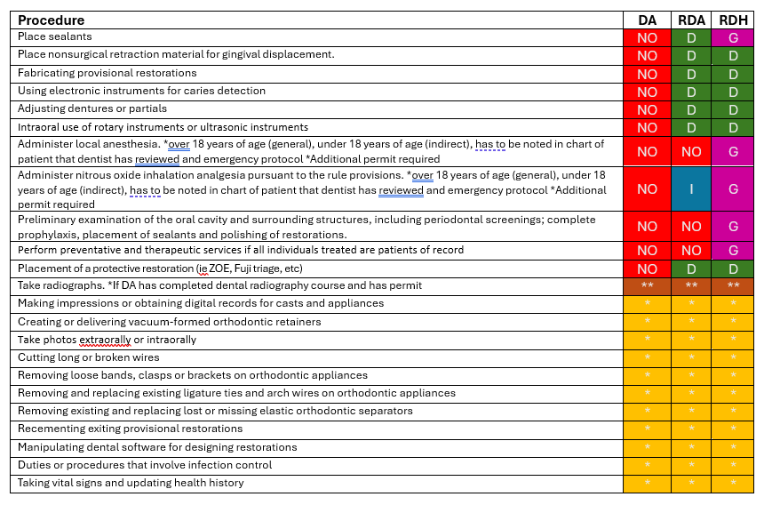 - If any delegated procedure specifically indicates a requirement to complete additional coursework, the Registered Dental Assistant or Dental Hygienist must complete the coursework to perform the procedure.